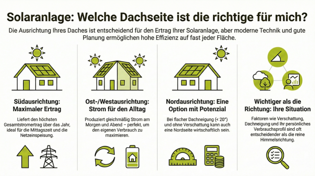 Infografik, die zeigt, welche Dachausrichtung sich am besten für Solarmodule eignet, mit Symbolen und kurzen Erklärungen für jede Option.