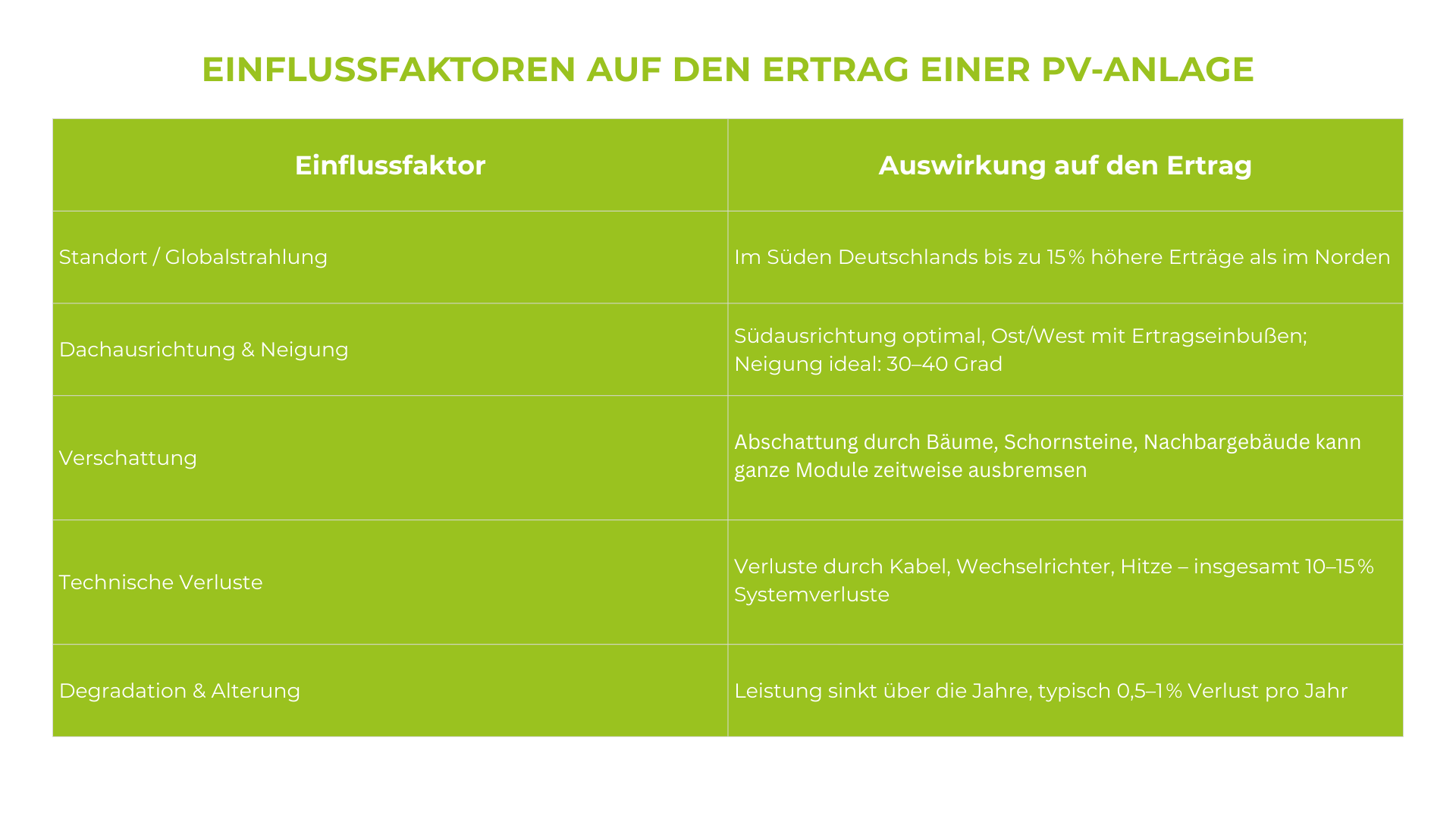 Tabelle mit den Faktoren, die den Ertrag von PV-Anlagen beeinflussen, einschließlich Standort, Abschattung, Neigung, technische Verluste und Degradation.