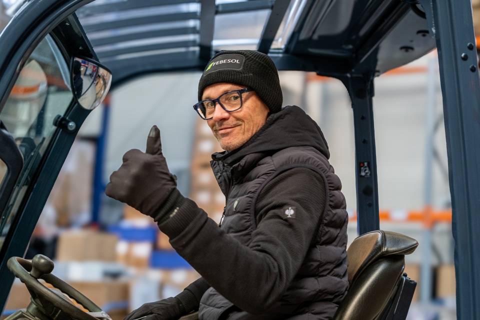Ein Mann in schwarzer Winterkleidung zeigt den Daumen nach oben, während er auf einem Gabelstapler in einem Lagerhaus sitzt.
