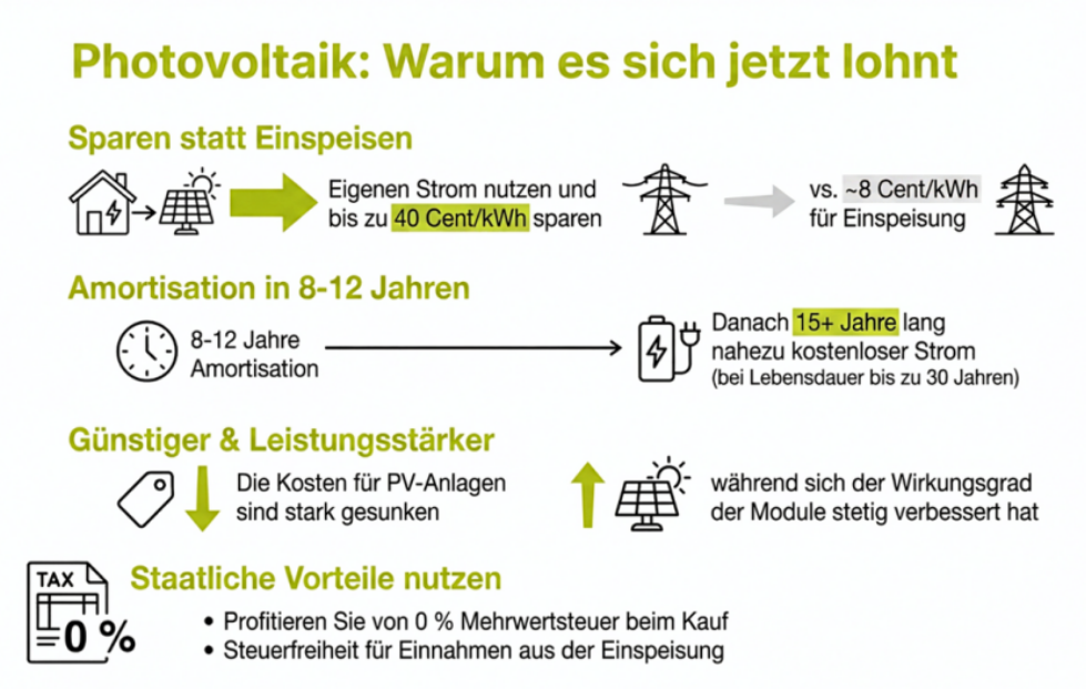Infografik zu Vorteilen von Photovoltaik: Kosten, Amortisation, Einsparung und staatliche Vorteile.